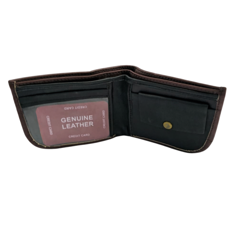 The AFFA Men’s “Cona Cut” Walletย is a lightweight bifold with a durable PU exterior and a Genuine Leather interior. It features 2 money sections, 1 card slot, 1 coin pocket, and 2 middle side pockets. Measuring 4.5 x 3.5 inches, it weighs just 75 grams and comes in Black, Brown, and Tan.
